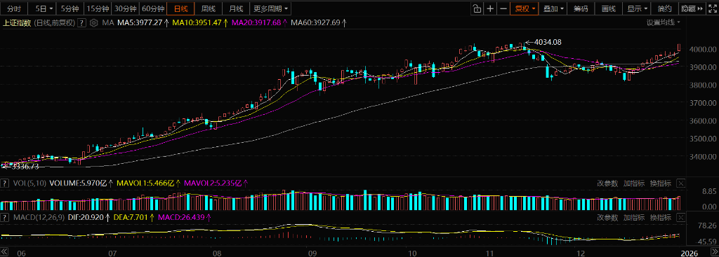 高盛Hui Shan策略师团队在最新发布的策略报告中对中国资产发出强烈的看多信号,建议投资者在区域背景下“超配”中国股票。该行预测,受企业盈利增长和估值修复的双重驱动,中国股市在2026年和2027年将迎来稳健的牛市行情,预计年均上涨幅度将达到15%至20%。1月5日,A股全天高开高走,沪指实现12连阳,创1993年以来最长连涨纪录,且重返4000点上方。