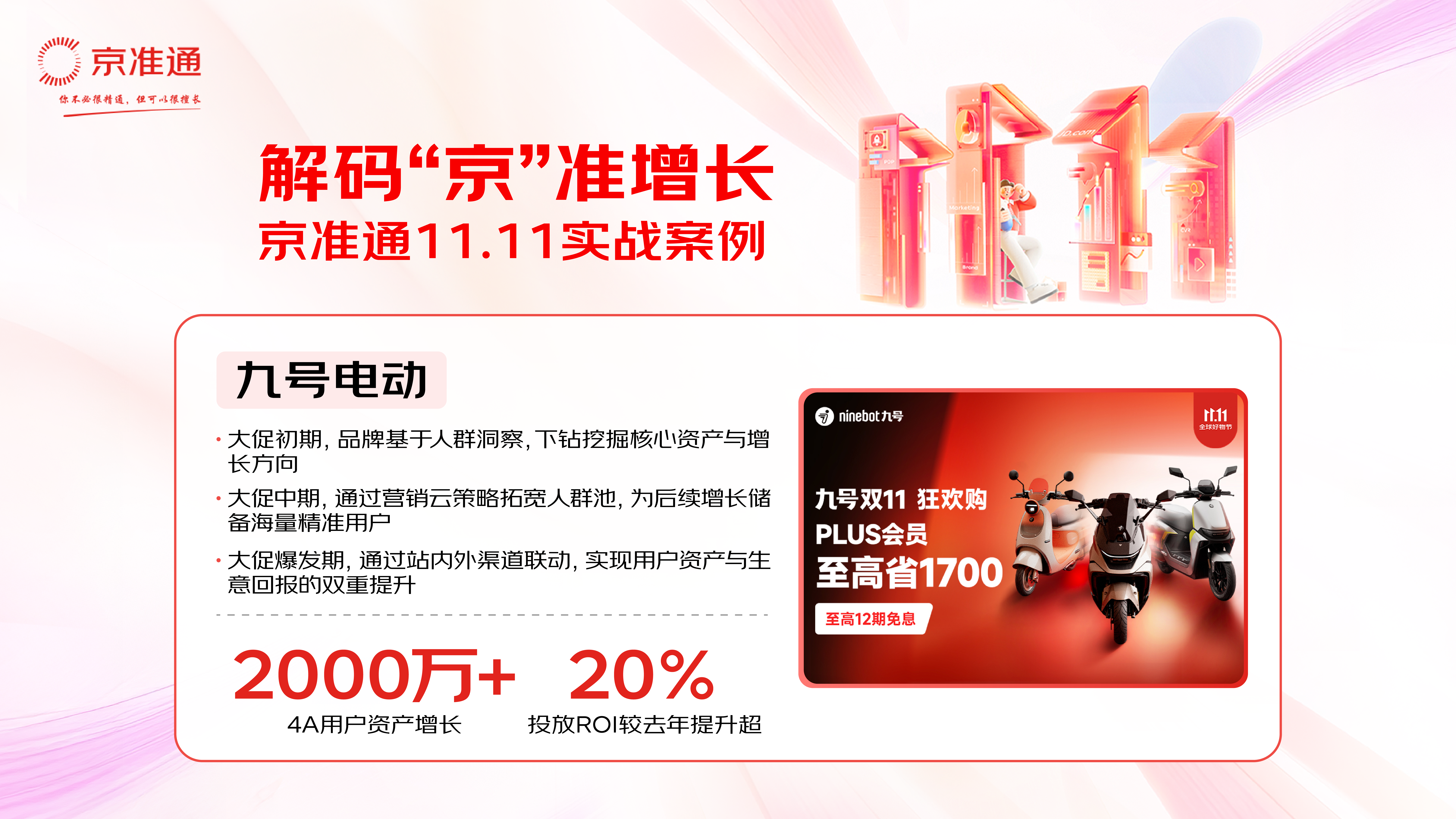 实现增长的还有九号电动品牌。2025年京东11.11期间,九号电动继续冲刺新高峰,品牌京东官方旗舰店达成4A用户资产增长超千万,投放ROI较去年有了大幅提升。