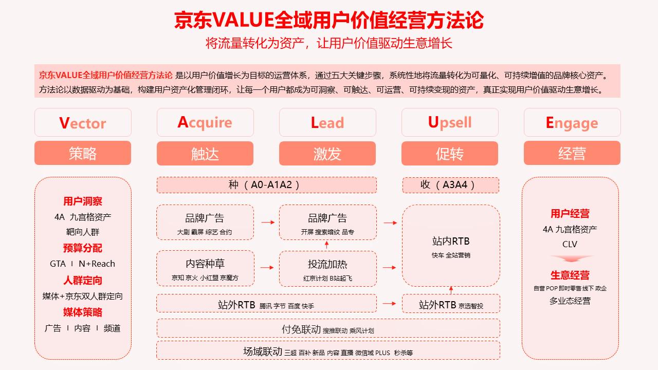 在数字经济时代,用户已经成为品牌最核心的资产,精准营销的核心早已从“流量收割” 转向 “用户深耕”。京东VALUE全域用户价值经营方法论正是抓住了这一核心趋势,通过数智化工具与系统化方法论的结合,为品牌构建长期竞争力提供了关键支撑。