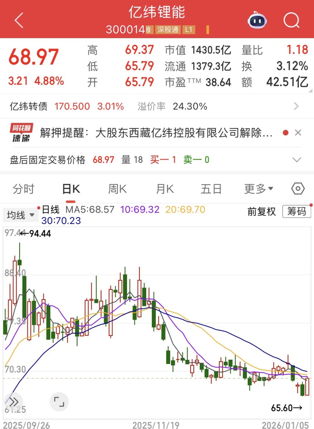 二次递表信息传出后,资本市场反应迅速。1月5日,亿纬锂能在A股今年的首个交易日赢得开门红,收于68.97元/股,涨4.88%。