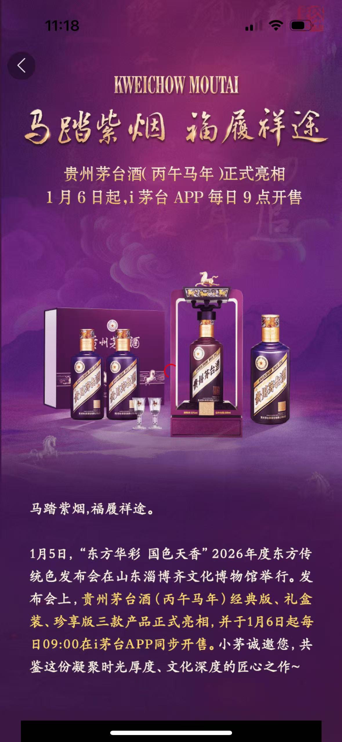 有接近贵州茅台的人士向中国商报记者介绍,1月5日,在“东方华彩 国色天香”2026年度东方传统色发布会现场,贵州茅台丙午马年生肖系列产品(以下简称马年生肖酒)上市。