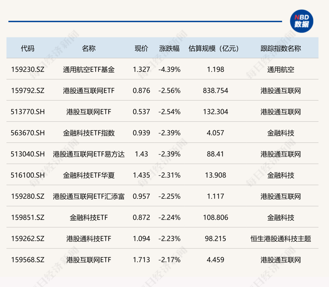 下跌方面,通用航空ETF基金跌超4%,港股互联网、金融科技等ETF跌超2%。