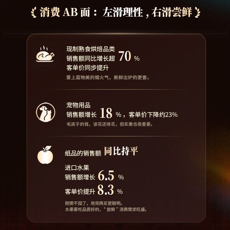 与此同时,民生刚需与品质尝鲜的消费平衡同样呈现在宠物用品、纸品和进口水果等品类方面。物美多点数据显示,面巾纸等纸品类民生必需品2025年的销售额和消费意愿与2024年基本持平,消费者转向“按需购买”;反映出消费者在宠物用品消费中更乐于精打细算挑选高性价比产品,整体更趋理性。相比之下,进口水果作为生活品质提升的代表性品类,2025年销售额和客单价双双提升,表明消费者在必需品上节省的部分预算,正流向能带来愉悦体验的品质消费。