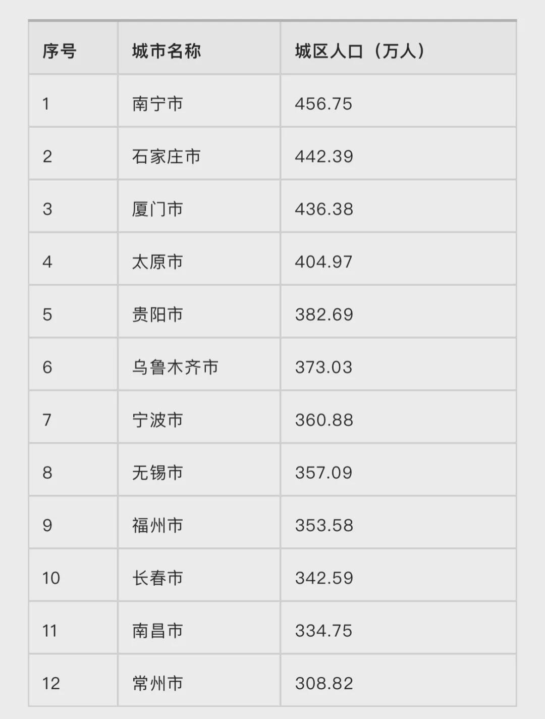 此外,与南宁、贵阳都同属于Ⅰ型大城市(城区常住人口在300-500万)的,还有石家庄、厦门、太原、乌鲁木齐、宁波、无锡、福州、长春、南昌、常州。