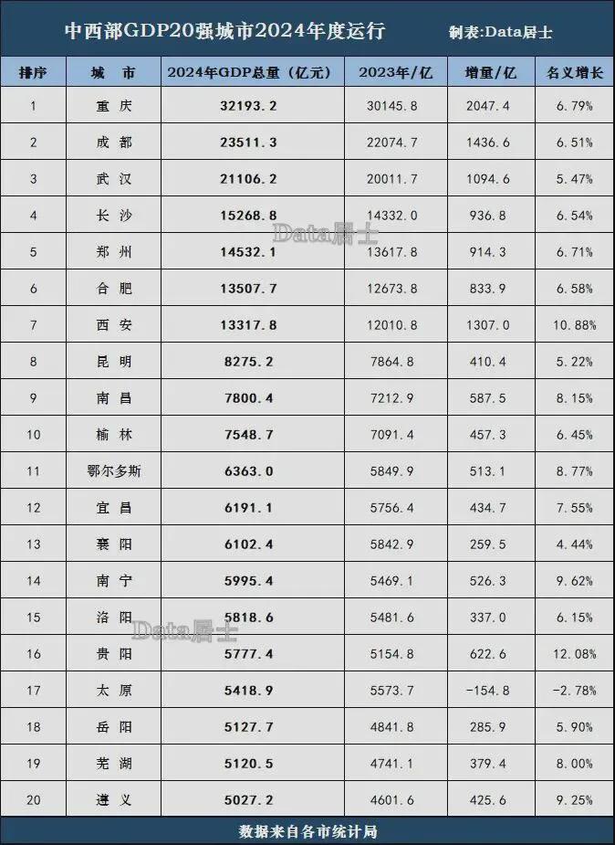 2024年,贵阳与南宁的GDP差距仅有200亿左右。未来几年,贵阳经济总量会否反超南宁,将是省会城市竞争中最具看点的存在。