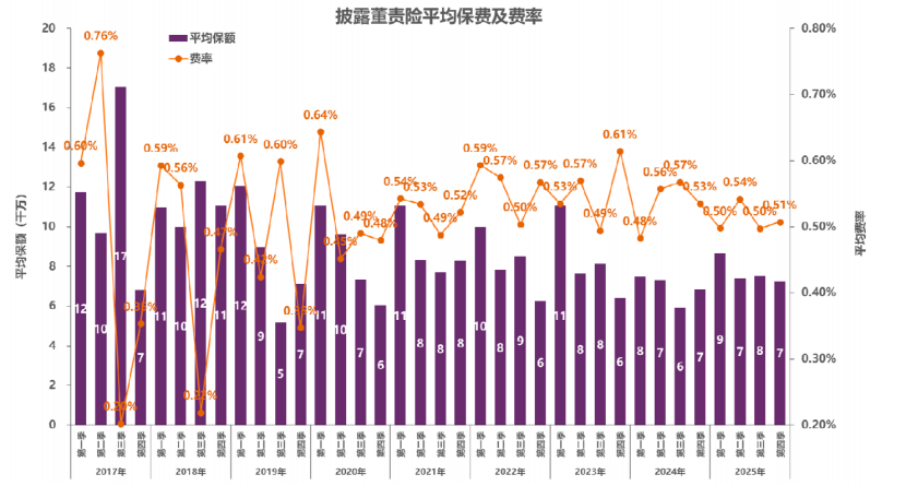 从下图的费率变化趋势可以看出,董责险费率呈现“先升后降”的明显转折,而当前正处于难得的投保窗口期。《报告》数据显示,2017-2022 年,董责险简单平均费率从千分之三逐步攀升至千分之六;2023 年起费率出现反转,持续下降至 2025 年第四季度的不足千分之五,实际平均费率可能更低。