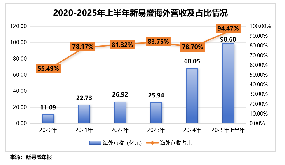 2025年上半年,公司海外营收高达98.6亿元,营收占比创历史新高,达到了94.47%。