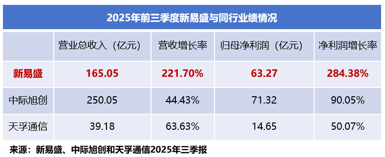 2025年前三季度,新易盛实现营收165.05亿元,同比大增221.7%;净利润63.27亿元,同比猛增284.38%;公司营收与净利润增速均远超中际旭创和天孚通信。
