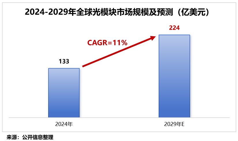 而这一增长态势具有明确的长期延续性。据权威机构预测,2024年至2029年,全球光模块市场规模的年复合增长率预计达到11%,到2029年这一市场规模有望突破224亿美元。