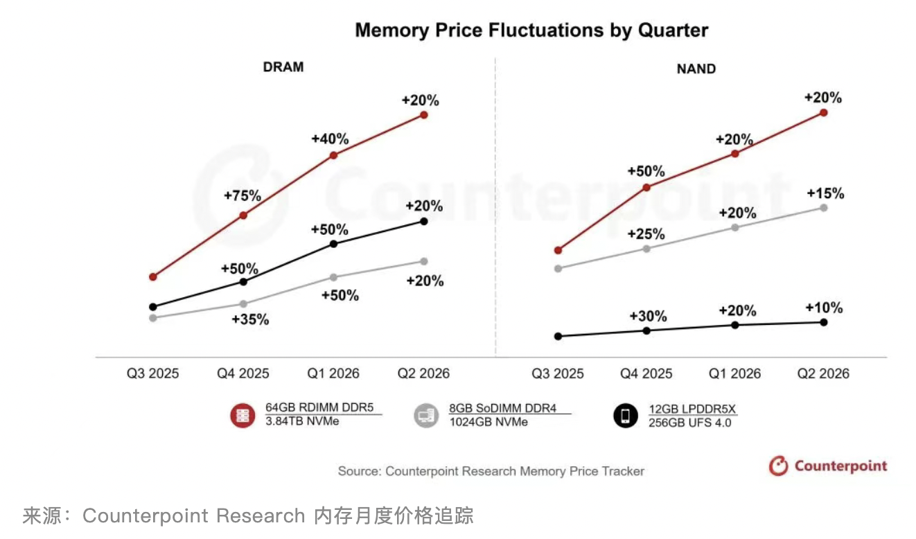 Counterpoint预计,2025年四季度内存价格将飙升40%-50%;2026年一季度还将再涨40%–50%,二季度预计再上涨约20%。