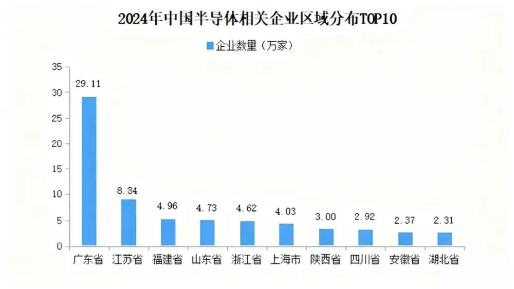 但如果我们放大视野,以省为区域观察对象来看国内的半导体产业布局,会发现在相关企业数量上广东省一骑绝尘,其后是江苏和福建,山东则紧随其后排名第4。