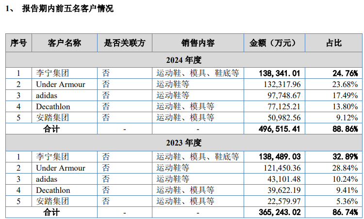 在业绩增长与产能扩张的背后,龙行天下面临的经营风险不容忽视,其中高客户集中度问题尤为突出。数据显示,2023年、2024年,公司前五大客户收入占公司营业收入的比重分别为86.74%、88.86%。具体来看,2024年度,李宁为公司第一大客户,销售占比24.76%,安德玛、阿迪达斯、迪卡侬、安踏集团分别以23.68%、17.49%、13.80%、9.12%的占比位列其后。