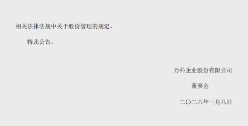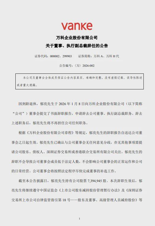 今天(1月8日),万科A(000002.SZ)发公告称,因到龄退休,郁亮于2026年1月8日向公司董事会提交书面辞职报告,申请辞去公司董事、执行副总裁职务。辞去上述职务后,郁亮将不再担任公司任何职务。