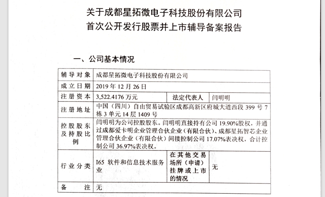 根据上市辅导备案报告披露,董事长闫明明为公司控股股东。闫明明直接持有公司19.90%股权,并通过成都爱卡明企业管理合伙企业(有限合伙)、成都星拓智芯企业管理合伙企业(有限合伙)间接控制公司17.07%表决权,合计控制公司36.97%表决权。