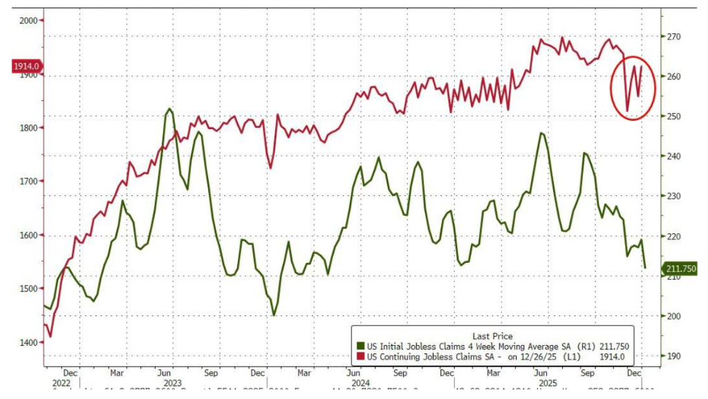 在截至12月20日的一周内,持续申领失业救济金人数增加5.6万人,攀升至191.4万人,延续了自感恩节和前期政府停摆等暂时性因素消退后的回升势头,并已重新站上190万人关口。