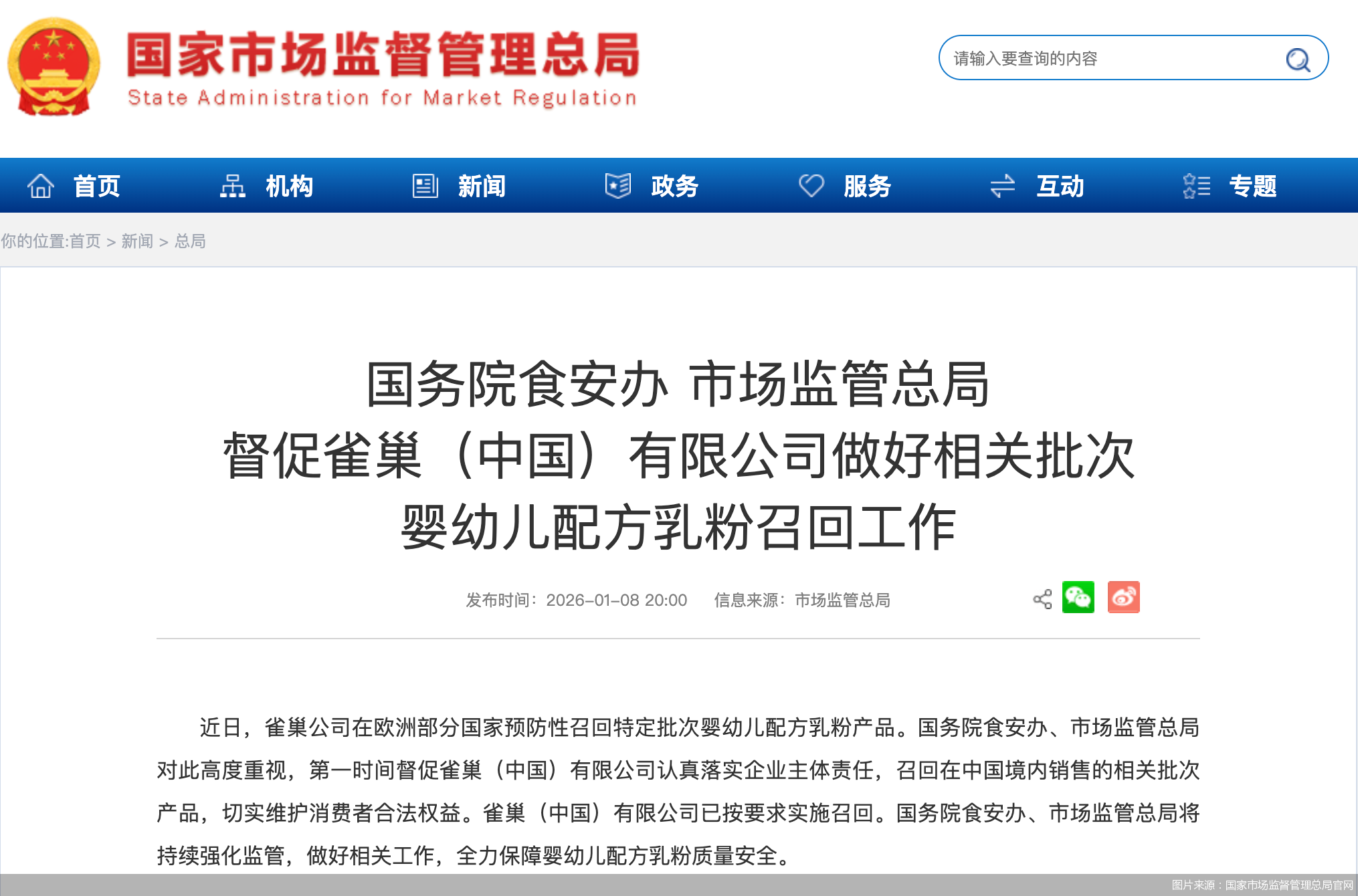 1月8日,雀巢集团再度发布消息称,可能存在有毒污染影响的婴幼儿配方奶粉,在全球召回范围进一步扩大至50国。当天晚间,国家市场监督管理总局官网公告,国务院食安办、市场监管总局对此高度重视,第一时间督促雀巢(中国)有限公司认真落实企业主体责任,召回在中国境内销售的相关批次产品,切实维护消费者合法权益。