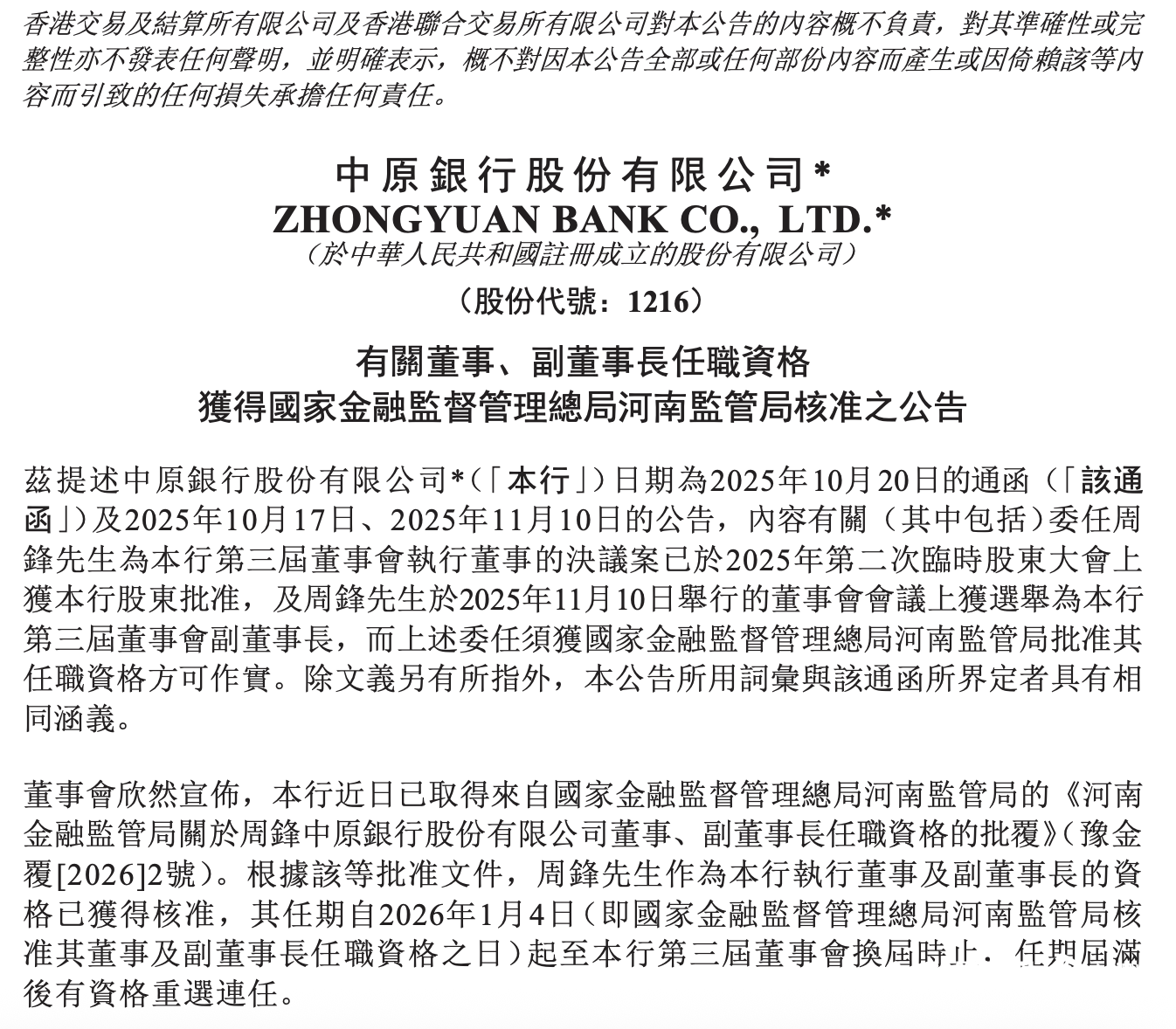 继日前获批出任中原银行行长一职后,周锋的履职程序再进一步。该行近日发布公告称,已收到国家金融监督管理总局河南监管局批复,核准周锋担任该行执行董事、副董事长的任职资格,其任期自2026年1月4日起至该行第三届董事会换届时止,任期届满后有资格重选连任。