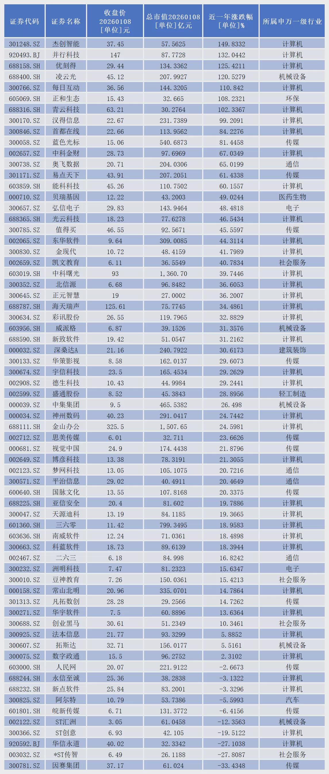 从二级市场表现看,截至1月8日收盘,近一年,已诞生杰创智能(301248.SZ)、并行科技(920493.BJ)、优刻得(688158.SH)、凌云光(688400.SH)、每日互动(300766.SZ)、正和生态(605069.SH)、青云科技(688316.SH)等7只翻倍股。