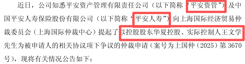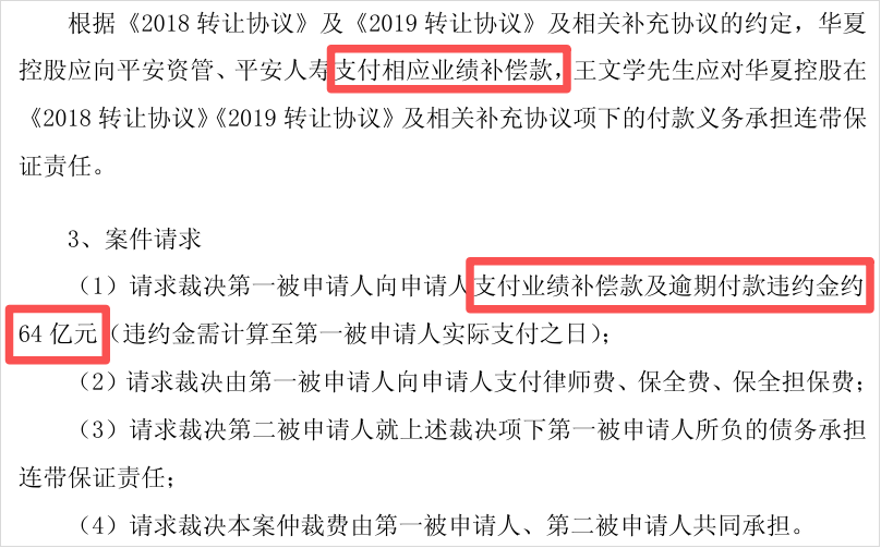 也就是开头提到的64亿官司,平安资管及平安人寿申请仲裁华夏控股及其实控人王文学。