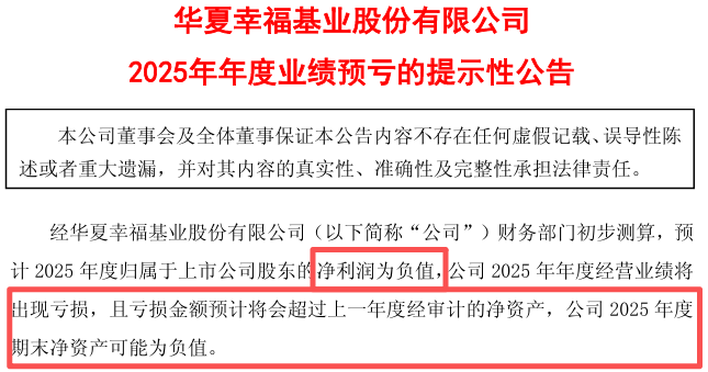另一则是华夏幸福2025年年度业绩预亏的提示公告,同样让人很绝望——