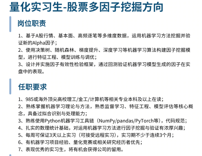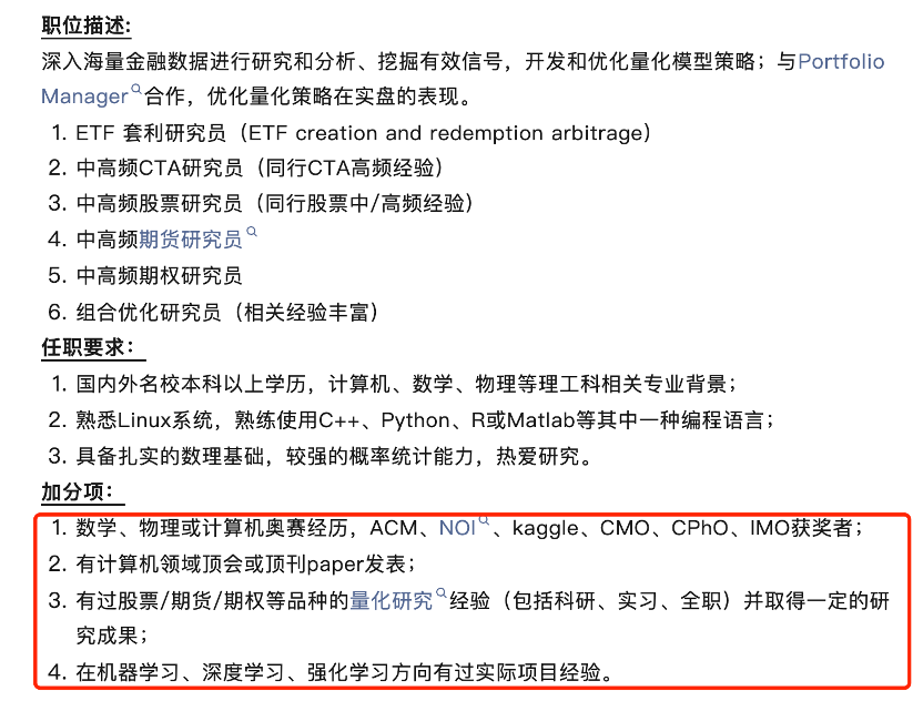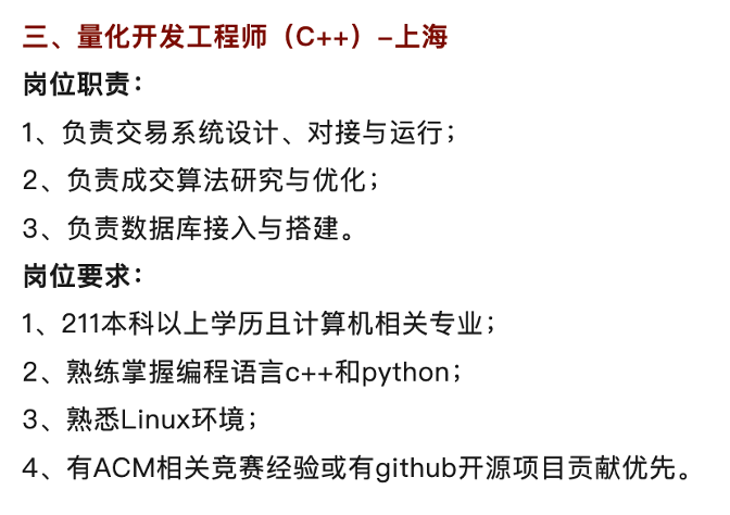 与传统金融岗位“学历+从业年限”的路径不同,量化私募对新人的筛选更接近科技公司。许多机构在公开招聘中将“985硕士/博士”、“编程竞赛获奖”、“顶级会议论文一作”等作为重要参考,部分岗位甚至直接以GPA和科研成果作为硬指标。