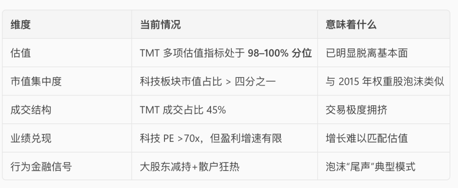 国际知名资产管理人约翰·邓普顿先生说过这样的经典金句:牛市总是在绝望中诞生,在怀疑中成长,在乐观中成熟,在疯狂中灭亡。以上的三个信号合并分析:A股科技板块正处于典型的“结构性泡沫后半段”。