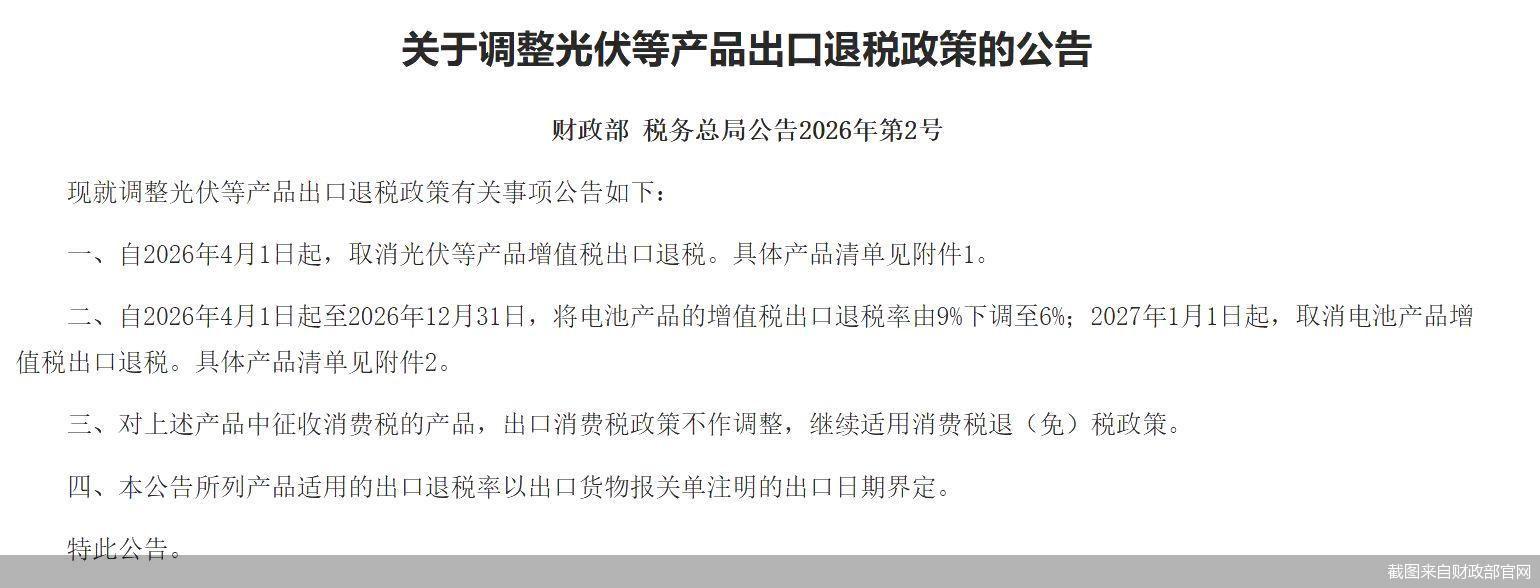 1月9日,财政部、税务总局发布公告称,自今年4月1日起,取消光伏等产品增值税出口退税。自2026年4月1日起至2026年12月31日,将电池产品的增值税出口退税率由9%下调至6%;2027年1月1日起,取消电池产品增值税出口退税。对上述产品中征收消费税的产品,出口消费税政策不作调整,继续适用消费税退(免)税政策。公告所列产品适用的出口退税率以出口货物报关单注明的出口日期界定。