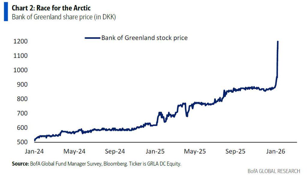 在地缘政治方面,市场正在追逐对冲资产。格陵兰银行股价在4天内上涨了33%,反映了市场对美国可能“收购”格陵兰岛的猜测。Hartnett指出,投资者正在抢先布局能源和原材料储备(委内瑞拉拥有全球17%的探明石油储量,北极拥有全球13%的未发现石油和30%的天然气)。