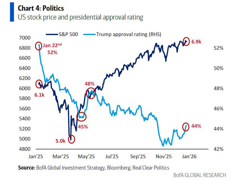 当前的宏观背景深受美国国内政治驱动。Hartnett指出,特朗普的支持率正处于低位(仅为43%),其中经济支持率为41%,而通胀处理的支持率更是低至36%。为了在中期选举前获得优势,特朗普政府必须降低通胀。