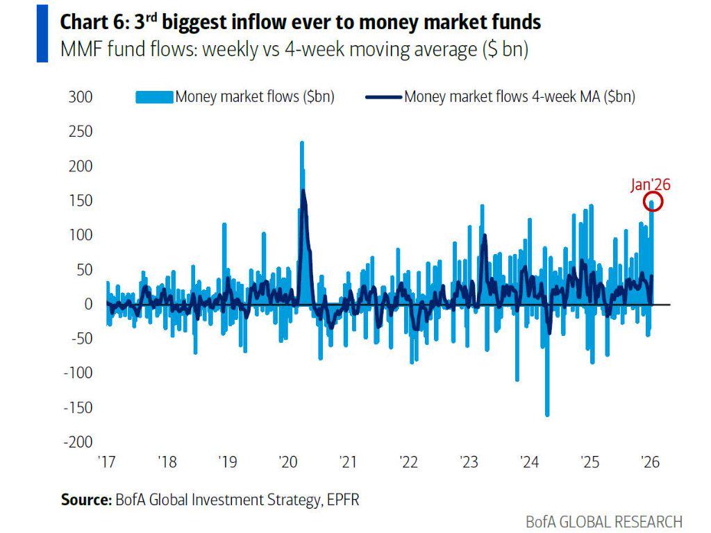 资金流向数据展示了极端的市场情绪。2026年第一周,货币市场基金(Cash Money Markets)迎来了惊人的1485亿美元($148.5bn)流入,这是有史以来第三大规模的单周流入。