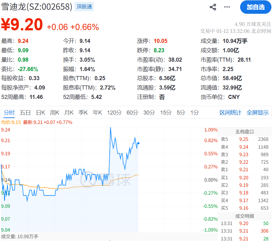 截至目前,雪迪龙股价报9.20元/股,上涨0.66%,总市值58.49亿元。