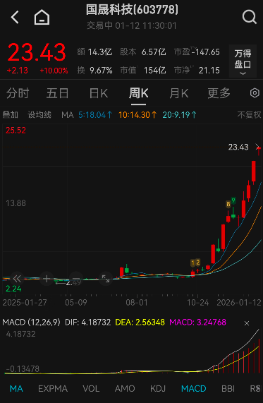 1月12日,国晟科技(603778.SH)复牌后股价再度涨停,收盘报23.43元/股。