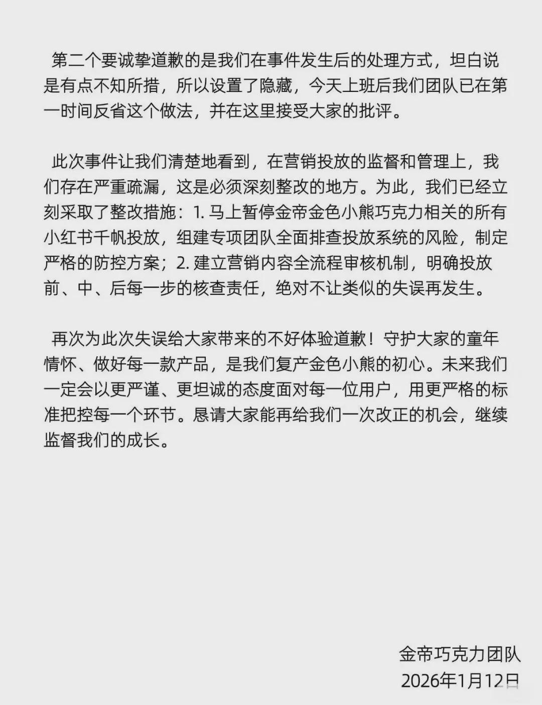 在1月12日发布的第一版致歉声明中,金帝承认了责任。“是我们对投放环节的把控不到位,才让大家产生了误解”,并表示团队已在第一时间反省这个做法,并采取相关整改措施:马上暂停金帝金色小熊巧克力相关的所有小红书千帆投放,组建专项团队全面排查投放系统的风险,制定严格的防控方案;建立营销内容全流程审核机制,明确投放前、中、后每一步的核查责任,绝对不让类似的失误再发生。