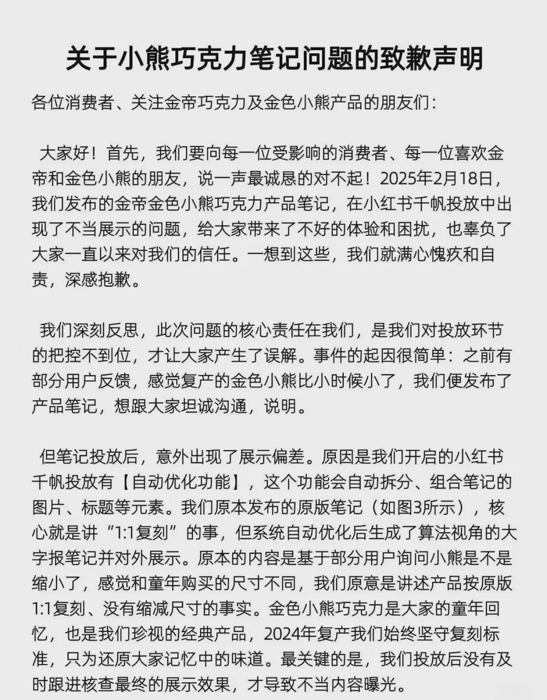 金帝巧克力在声明中解释称,事件的起因很简单,之前有用户反馈,复产后的金色小熊比小时候小了,品牌方便发布了产品笔记,品牌原意是讲述产品按原版1:1复刻、没有缩减尺寸的事实。但因为开启的小红书千帆投放有“自动优化功能”,这个功能会自动拆分、组合笔记的图片、标题等元素,导致系统自动优化后生成了算法视角的大字报笔记并对外展示。