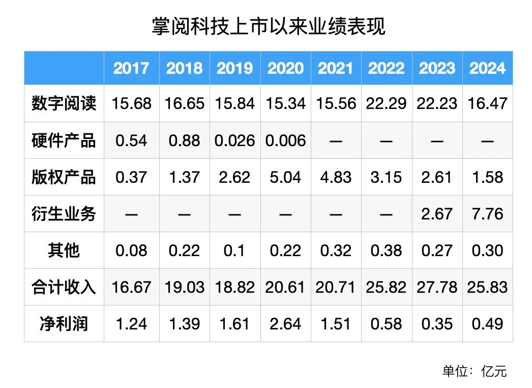 掌阅科技上市以来的转型之路也直观地表现在其业绩上。从2017年上市至2024年,数字阅读一直是对掌阅科技营收贡献最大的业务板块,公司总营收的变动与数字阅读业务的表现密不可分。具体来看,上市初期,数字阅读业务收入占比高达80%,随着移动互联网红利消退,以及互联网巨头下场加剧行业竞争,掌阅科技的数字阅读业务在2018年便增长放缓,并在随后的两年间连续下滑。