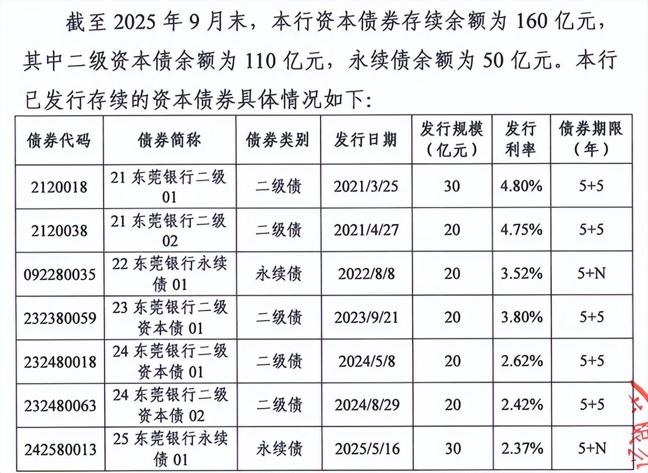 实际上,为缓解资本压力,东莞银行近年不缺努力,频繁借助债券市场“补血”。据该行在中国货币网披露的2025年三季报显示,2021年-2025年期间均有发行二级债或永续债,最近一期于2025年5月16日成功发行一笔30亿元规模的永续债。截至2025年9月末该行资本债券存续余额160亿元,其中二级资本债余额110亿元,永续债余额50亿元。