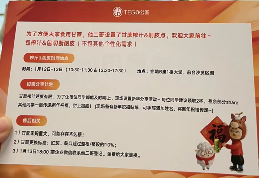 1月12日,腾讯TEG(技术工程事业部)2026年新年福利依旧延续“老传统”,为每位员工送上一根甘蔗。TEG办公室福利说明卡片上还标明了甘蔗榨汁、削皮地点。