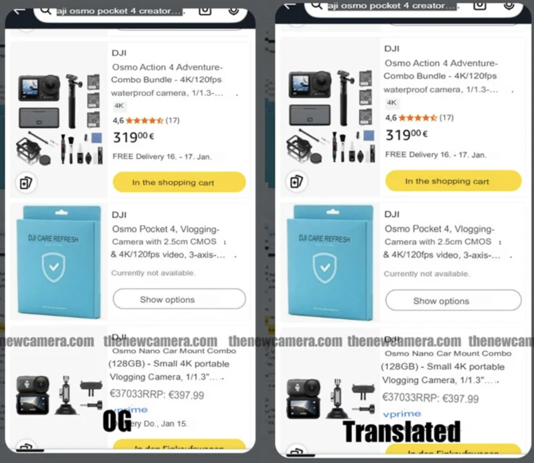 1月12日消息,一自媒体发布博文,称德国亚马逊官网最近出现大疆Osmo Pocket 4系列相机商品页,尽管页面很快被官方撤下,但还是有用户抓取到了快照。