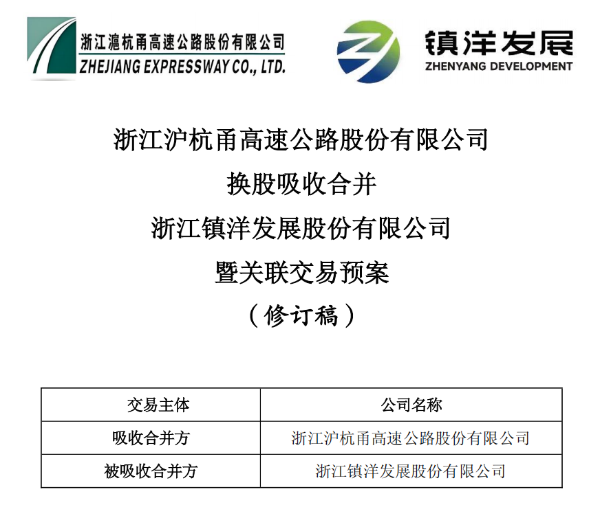 近日,镇洋发展(603213.SH)公告称,公司控股股东浙江省交通投资集团有限公司(以下简称“浙江交投集团”)拟筹划浙江沪杭甬和镇洋发展进行重大资产重组,交易方式为浙江沪杭甬向镇洋发展全体股东发行A股股票,通过换股方式吸收合并镇洋发展。