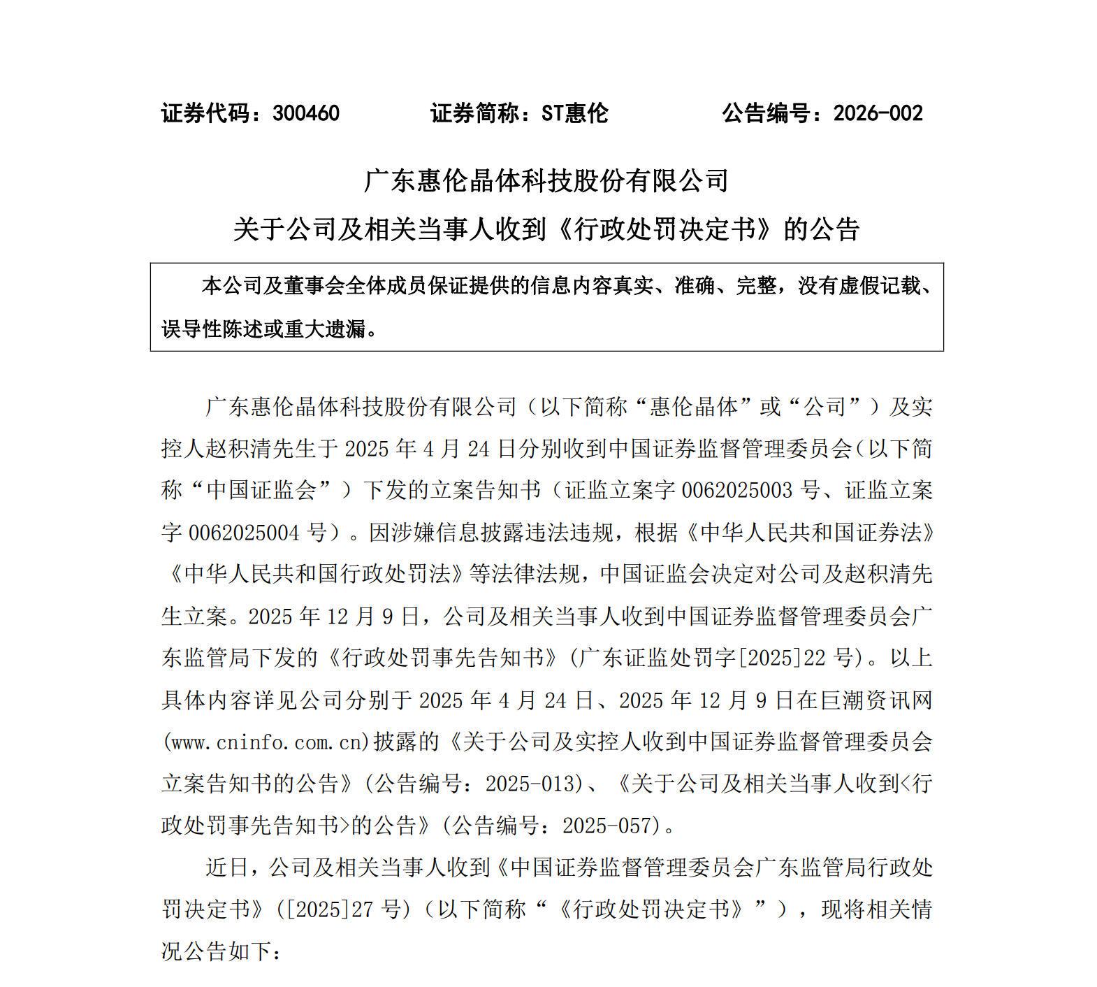 1月12日晚间,广东惠伦晶体科技股份有限公司(以下简称“惠伦晶体”)发布公告称,近日收到广东证监局《行政处罚决定书》,因2020年至2022年期间存在未披露资金占用、年度报告存在虚假记载等信息披露违法违规行为,公司及5名相关责任人被处以罚款,罚款合计共1140万。