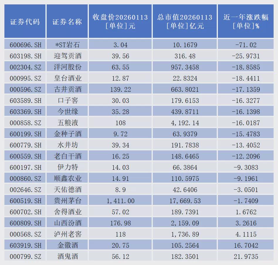 从二级市场表现看,截至1月13日收盘,近一年来,20只白酒股中有15只股价出现跌幅,占比高达75%。