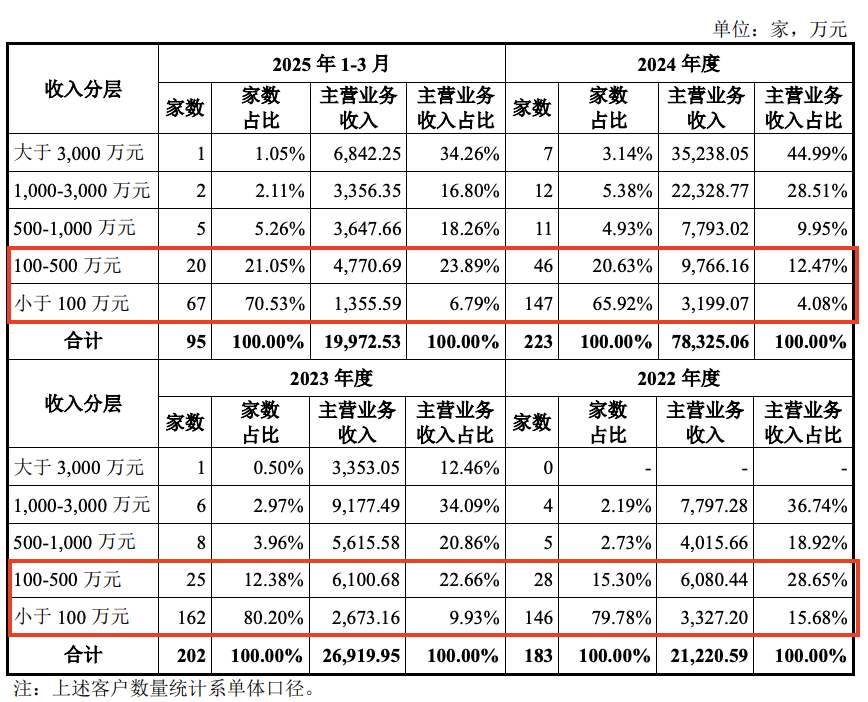具体表现为,2022年至2024年,头部客户收入贡献显著,前10%左右的客户贡献75%左右的收入。但2023年和2024年,公司收入在500万元以下的客户数量占比均在90%左右,但贡献收入均在30%左右。2024年度公司100万元以下的客户数量占比65.92%,仅贡献4.08%的收入。