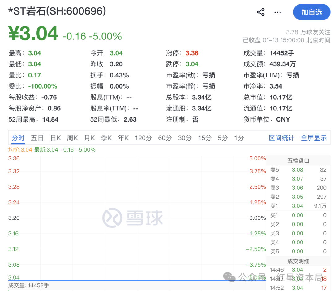 13日开盘后*ST岩石迅速一字跌停,报3.04元/股