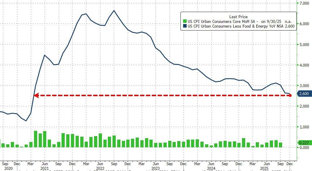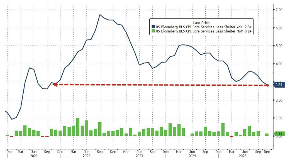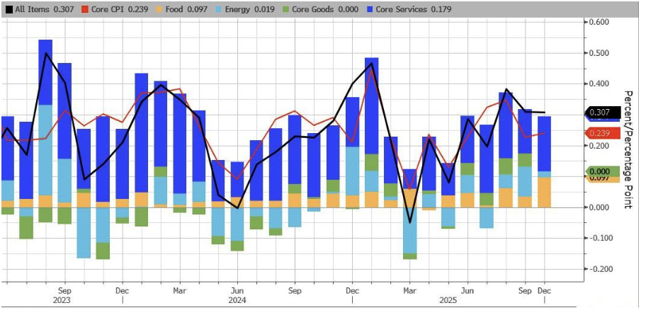 更受市场关注的核心CPI(剔除食品和能源)涨幅低于预期:12月环比仅上涨0.2%,同比涨幅为2.6%,持平于前值且低于市场预期的2.7%。这一同比涨幅为2021年3月以来的最低水平,也被视为继11月数据后,对通胀下行趋势的进一步确认。此前11月数据曾因政府停摆导致价格采集受限、季节性折扣被放大,一度影响市场对通胀真实走势的判断。