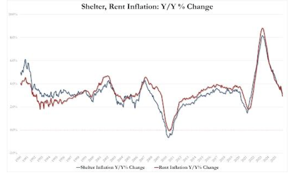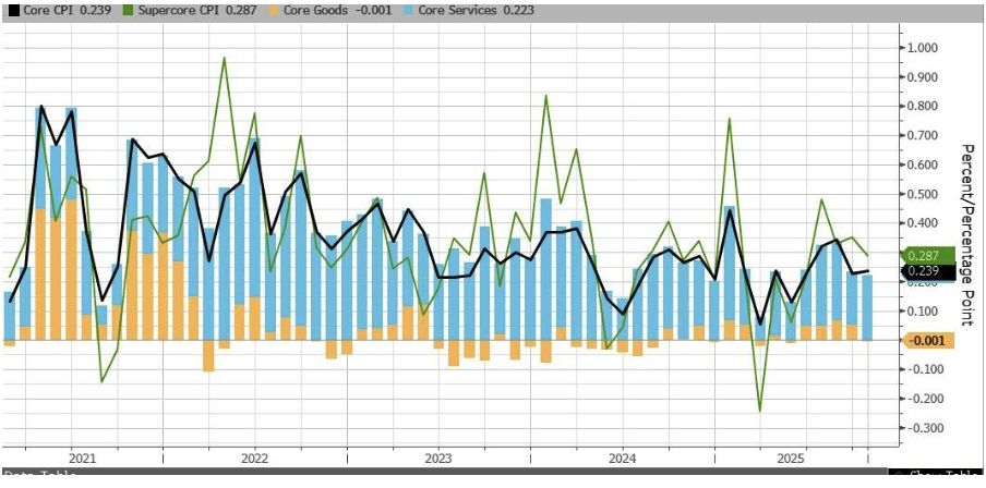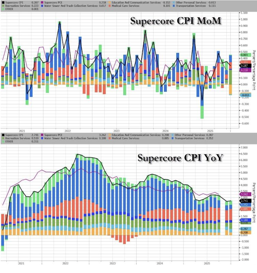 进一步拆分显示,核心商品价格环比下降,而服务价格则出现小幅加速。值得关注的是,美联储长期跟踪的“超级核心通胀”指标(不含住房的服务价格)同比增速继续放缓,已降至2021年9月以来的最低水平。