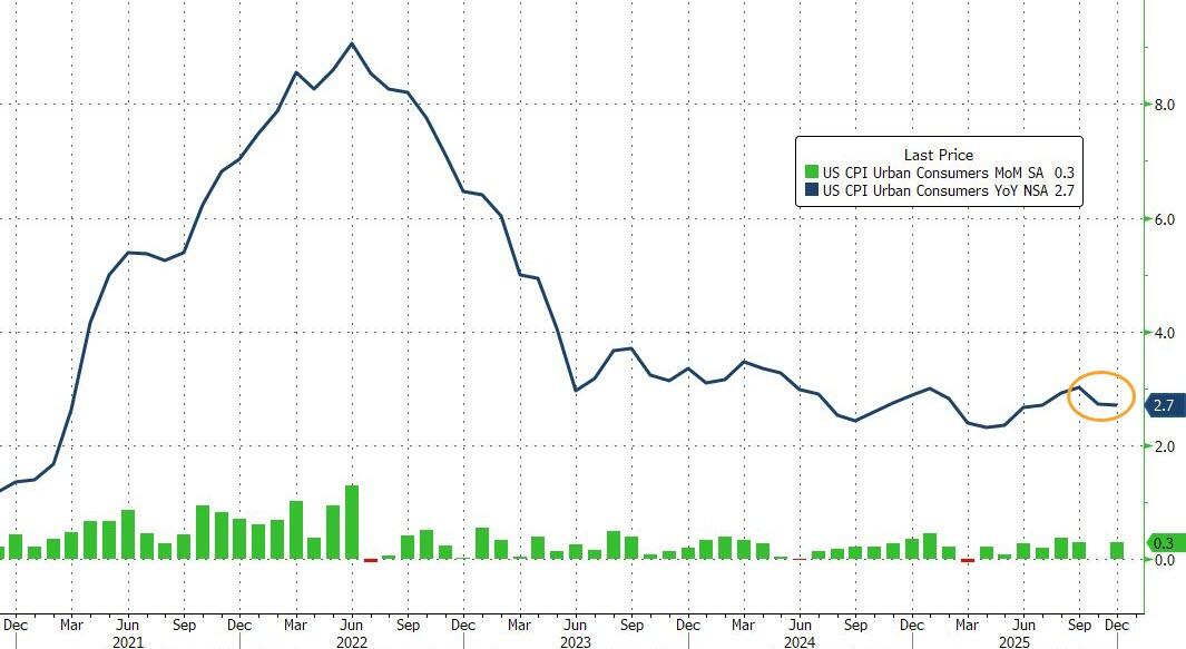 美国12月CPI同比增长2.7%,持平预期,同时持平于前月四年来最低水平。美国12月CPI环比0.3%,持平预期和前值。