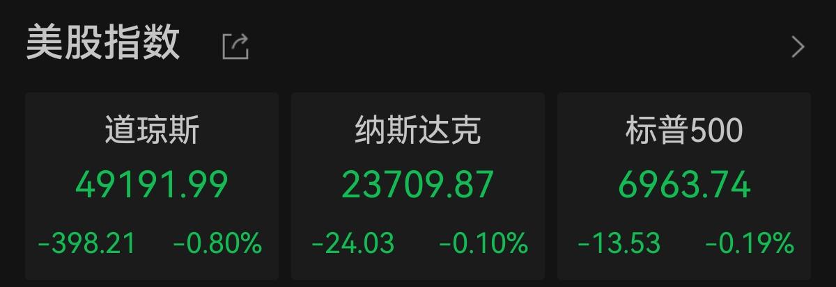 中新经纬1月14日电 美东时间周二,美股三大指数集体下跌。截至收盘,道指跌0.8%报49191.99点,纳指跌0.1%报23709.87点,标普500指数跌0.19%报6963.74点。
