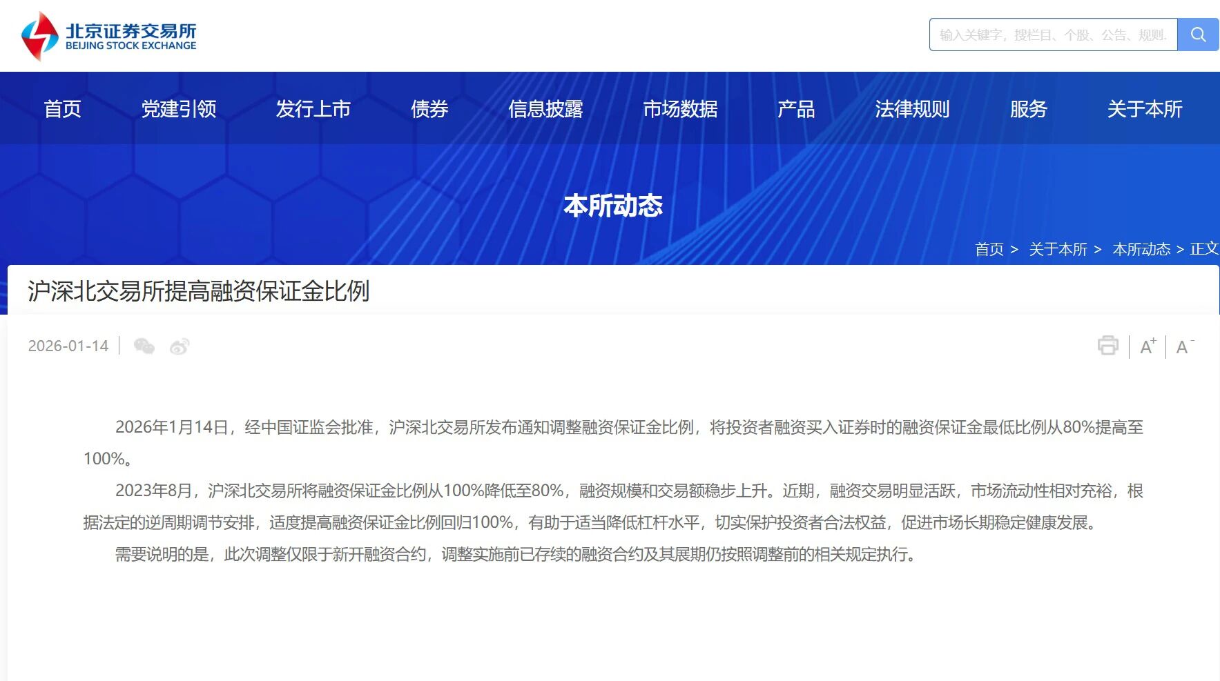 【沪深北交易所将投资者融资买入证券时的融资保证金最低比例从80%提高至100%】2026年1月14日,经中国证监会批准,沪深北交易所发布通知调整融资保证金比例,将投资者融资买入证券时的融资保证金最低比例从80%提高至100%。