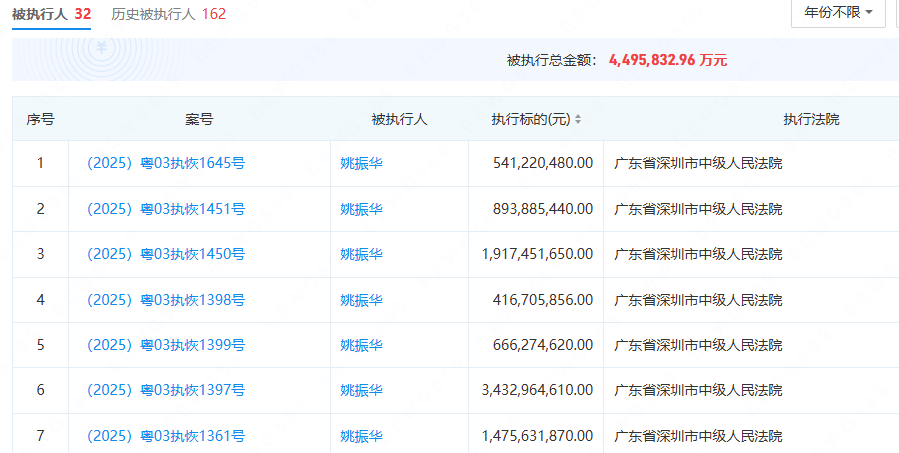 企查查显示,姚振华已经是失信被执行人,被执行总金额高达450亿。