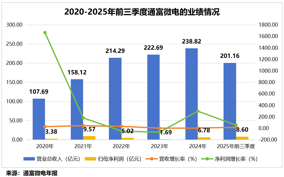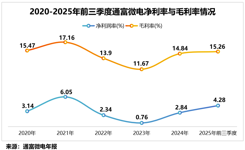 2020-2025年前三季度,通富微电的毛利率始终在20%以下水平,远低于行业平均水平(35%);净利率也在最高也才6.05%,最低仅有0.76%。